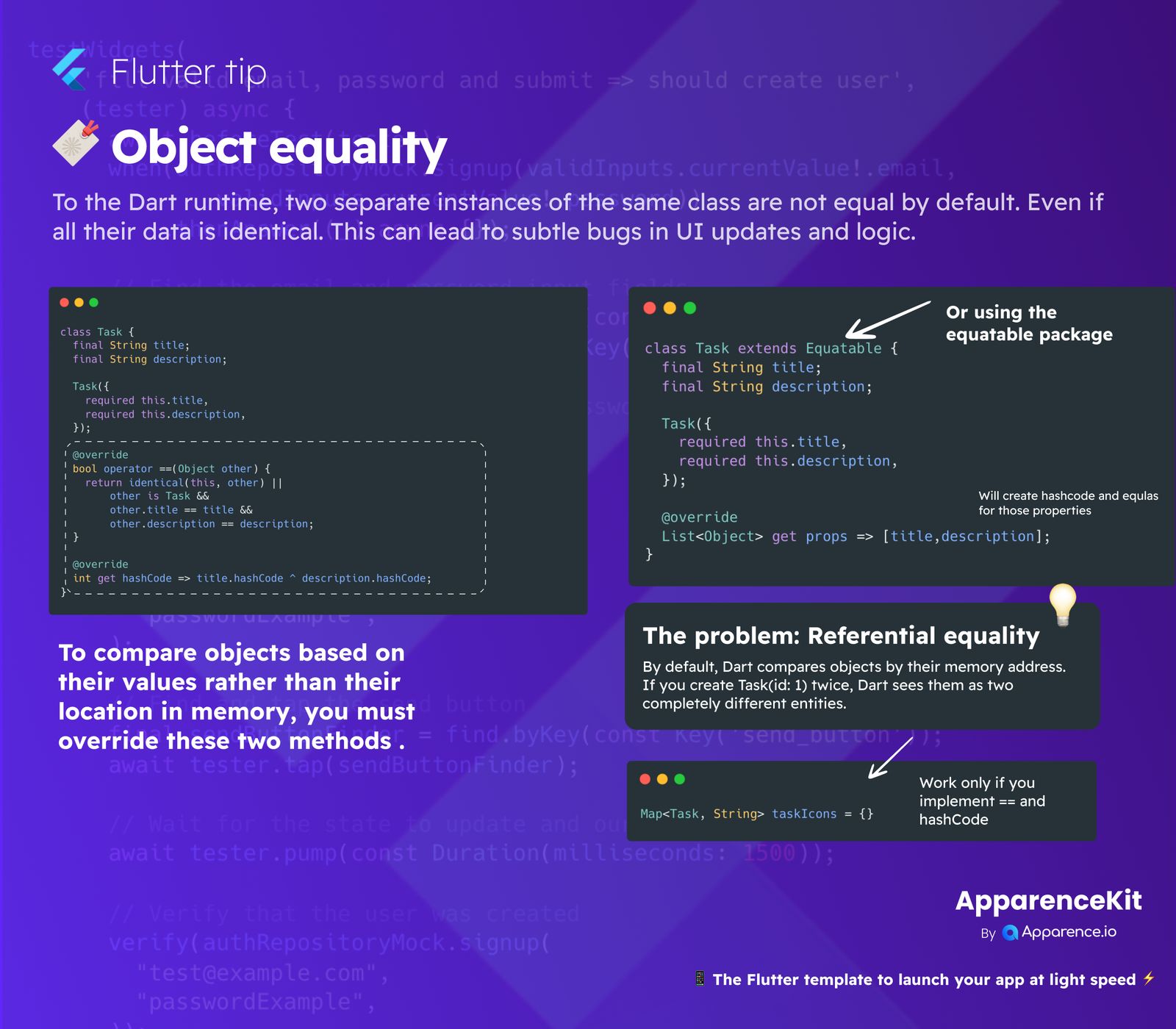 To the Dart runtime, two separate instances of the same class are not equal by default, even if all their data is identical. This behavior can lead to subtle bugs in your app's user interface updates and overall logic.