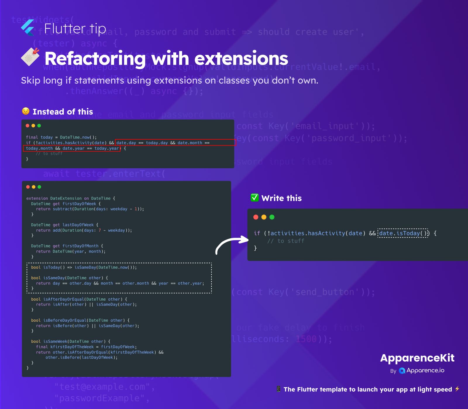 Are you looking to make your Flutter app's code cleaner and easier to manage? Sometimes, simple checks can lead to surprisingly long and complicated lines of code. This is especially true for conditional statements that compare dates. But there's a neat trick to keep things tidy: Dart extensions!