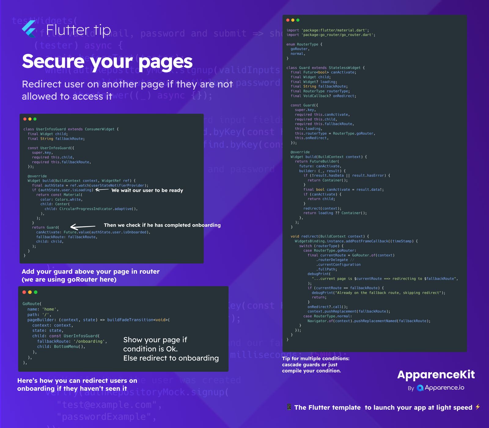 ApparenceKit provides a Flutter template designed to help you launch your app at light speed, often including robust solutions for page security.